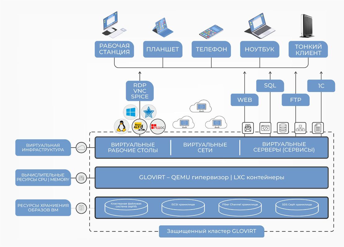 В системе виртуализации могут одновременно размещаться несколько необходимых для работы ИТ-инфраструктуры серверных ресурсов: WEB, DHCP, почтовый сервер, служба каталогов, базы данных, ERP, ECM, CAD и ГИС-системы с централизованным хранением, обработкой и доступом к данным.